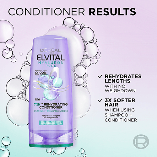 L'Oréal Paris Elvital Hyaluron Pure Conditioner er en balsam som er utviklet til fet hodebunn og tørre lengder. Balsamen gir fukt til lengdene uten at håret føles tungt. Formelen er beriket med salisylsyre og hyaluronsyre Brukes sammen med Elvital Hyaluron Pure, Oil Erasing Scalp Serum og Elvital Hyaluron Pure fuktighetsgivende Balsam.