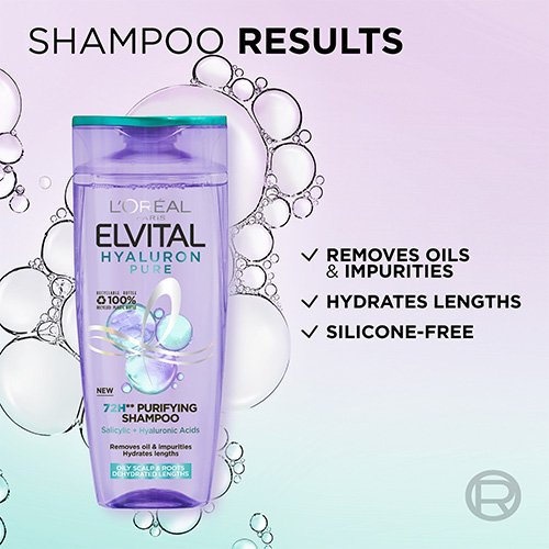Start rutinen med Elvital Hyaluron Pure, Oil Erasing Scalp Serum. Påfør deretter Elvital Hyaluron Pure sjampo i vått hår. Masser lett og skyll ut. Fullfør rutinen med Elvital Hyaluron Pure balsam. Skyll straks med rikelig med vann ved kontakt med øynene.