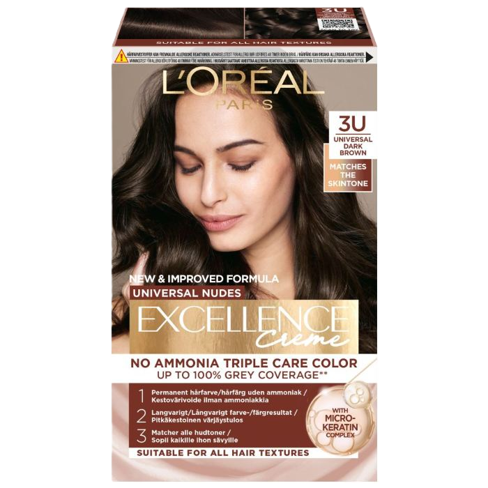 L'Oréal Paris Excellence Universal Nudes er en permanent hårfarge uten ammoniakk til alle hårtyper. Nyansene er utviklet for å passe til alle hudtoner og dekker grå hår opptil 100 %. Formelen gir håret næring og glans**.