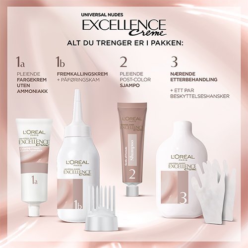 L'Oréal Paris Excellence Universal Nudes er en permanent hårfarge uten ammoniakk til alle hårtyper. Nyansene er utviklet for å passe til alle hudtoner og dekker grå hår opptil 100 %. Formelen gir håret næring og glans**.