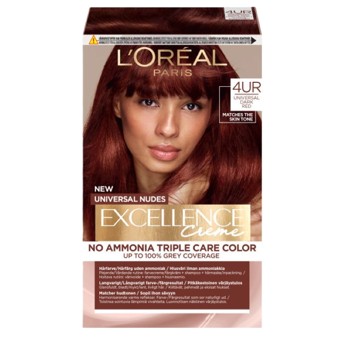 L'Oreal Paris Excellence Universal Nudes er en ammoniakkfri hårfarge med reflekser som matcher hudtonen, for et resultat som ser naturlig ut og som dekker grå hår opptil 100%. Refleksen 'U' i L'Oréal Paris, Excellence Universal Nudes er en unik blanding av varme og kalde reflekser for et fyldig, naturlig fargeresultat.