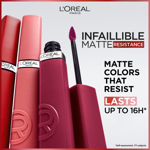 L'Oréal Paris Infaillible Matte Resistance er en langvarig matt flytende leppestift med intense fargepigmenter som holder i opptil 16 timer*. Den matte ultralette formelen er beriket med hyaluronsyre, er enkel å påføre og føles behagelig på leppene. Leppestiften er svetteresistent, smitter ikke av eller kladder og fargen sitter godt hele dagen. Myk og presis svampapplikator som gir deg intens farge allerede ved første strøk over leppene.