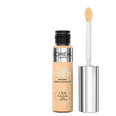 L'Oréal Paris True Match Radiant Serum Concealer har medium-høy dekkevne, nøytraliserer mørke ringer og minsker synligheten av poser under øynene. Innovativ kombinasjon av fargekorrigerende pigmenter og aktive ingredienser i et ultimat hybridprodukt innenfor hudpleie og makeup: Triple-power concealer som nøytraliserer mørke ringer, jevner ut fine linjer og minsker poser under øynene. Drevet av 1,5 % hyaluronsyre og et koffeinkompleks for å gi huden vakker glød og etterlate den fyldig og fuktet i opptil 24 timer.