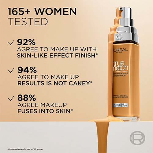 Finn din perfekte match med L'Oréal Paris True Match Super-blendable foundation. Formelen er superenkel å tone ut og tilpasser seg perfekt til hudtonen for å gi en plettfri look som ser naturlig ut. Den lette konsistensen gir lett dekning uten at huden ser pudderaktig ut eller at formelen kaker seg. Formelen består av en fuktighetsgivende base beriket med hyaluronsyre for 24 timers fukt*.